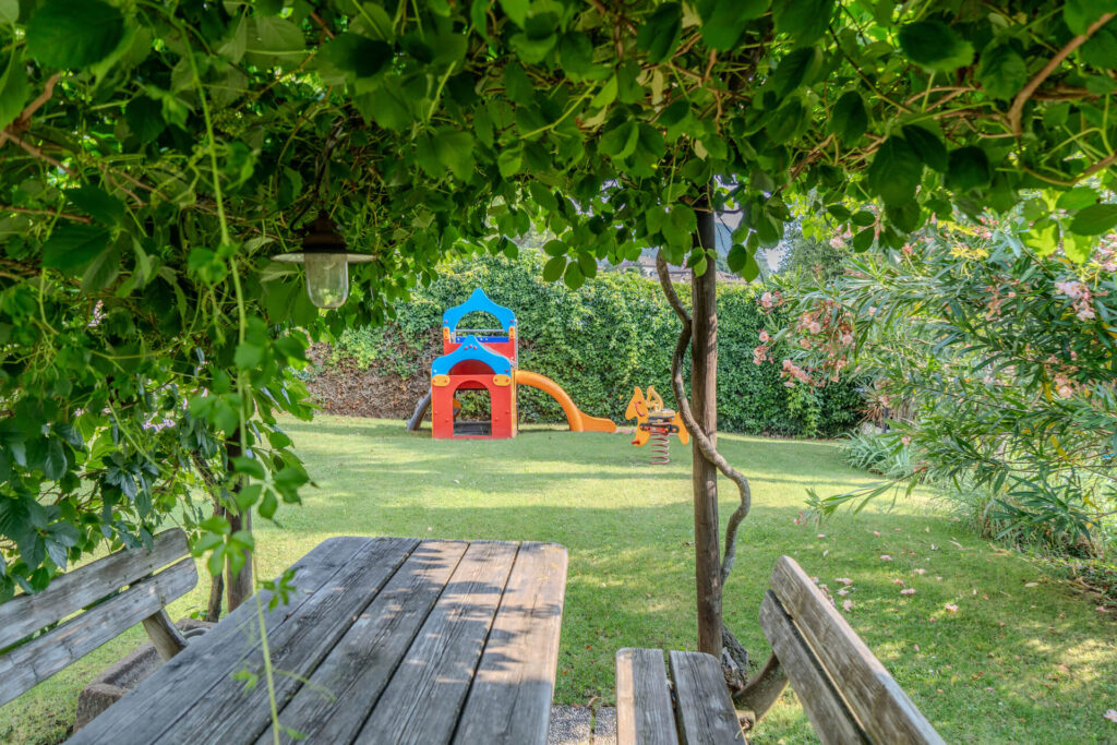Im Garten befindet sich ein liebevoll gestalteter Spielbereich mit Rutsche und Schaukel, der speziell für unsere jüngsten Gäste gedacht ist. Während die Kinder sich spielerisch bewegen und austoben, können Eltern ganz entspannt in der Nähe bleiben und die gemeinsame Zeit genießen.