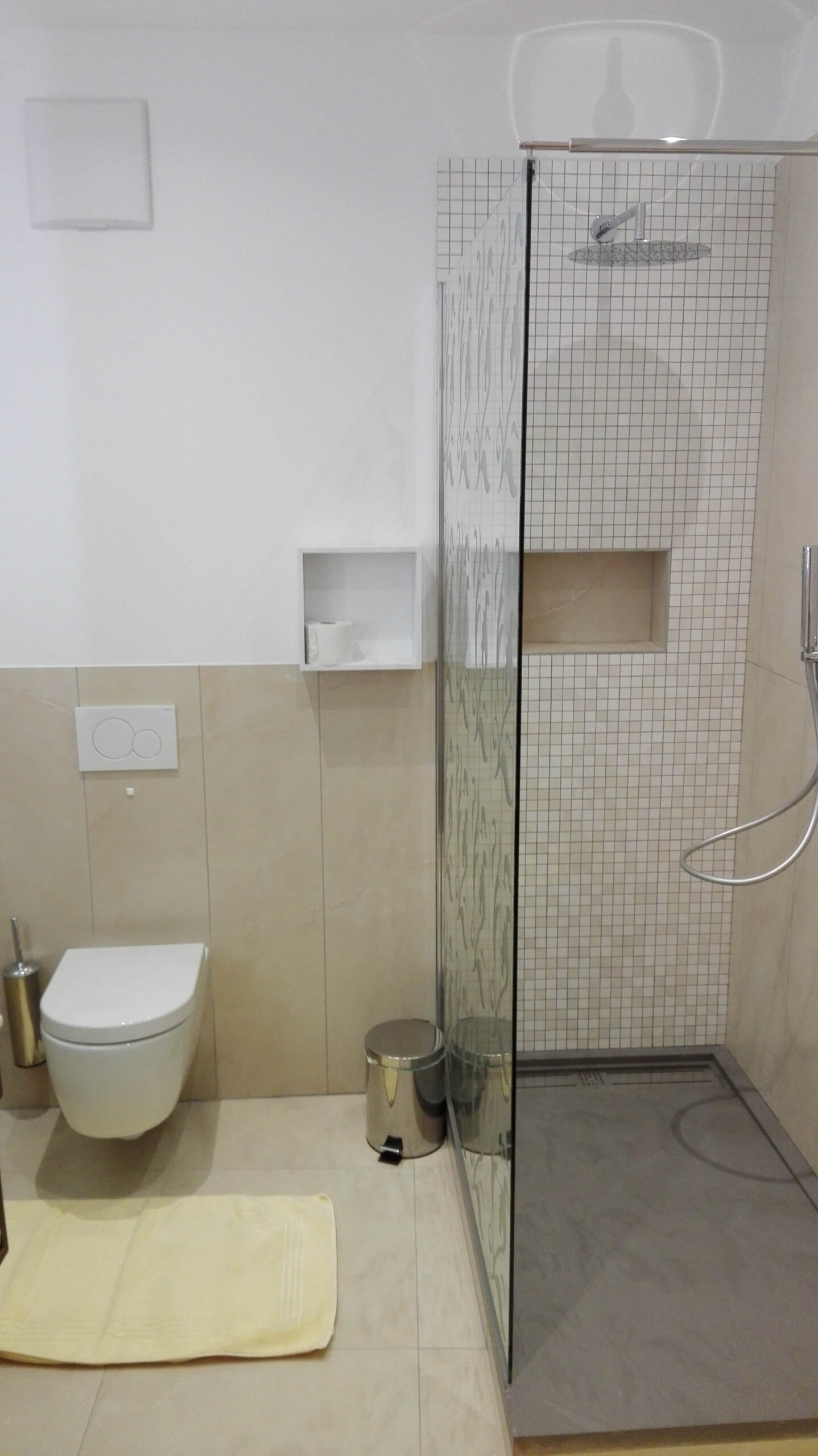 Geräumige Ferienwohnung mit viel Platz für Familien: großes Badezimmer, separates Kinderzimmer und eine wohnliche Küche mit Sitzecke.